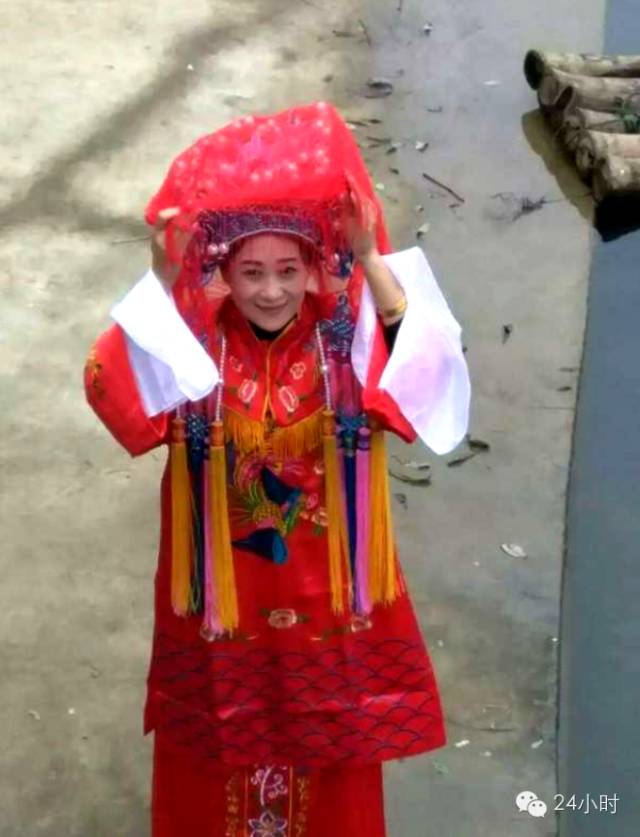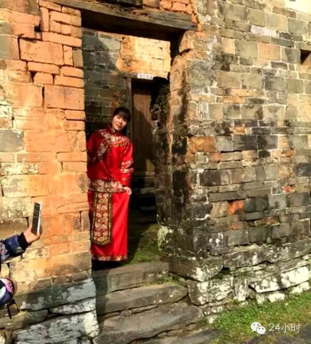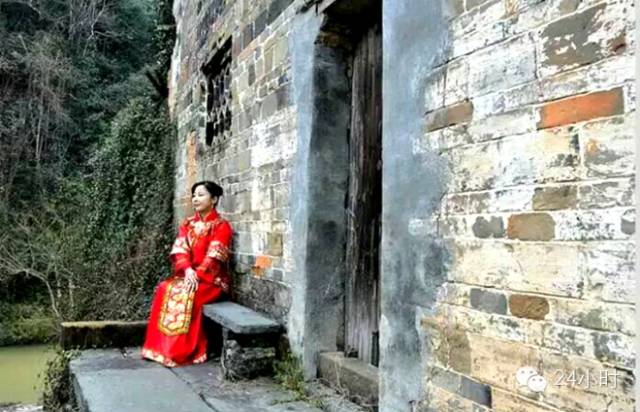 在众人的拥簇下,迎亲的队伍沿着阊江河畔,来到了溶口百年老街。 看着“新郎”牵着下轿后的“新娘”漫步古街时,许多村民及户外爱好者,争着和“新郎”、“新娘”合影留念。 迎亲结束后,几名户外爱好者迫不及待的换上火红火红的新娘装,坐在花轿里、站在竹排上、走在石板上、靠在古弄巷里等摆出不同姿势,脸上堆满笑容,心满意足的当了一回“徽州新娘”。
