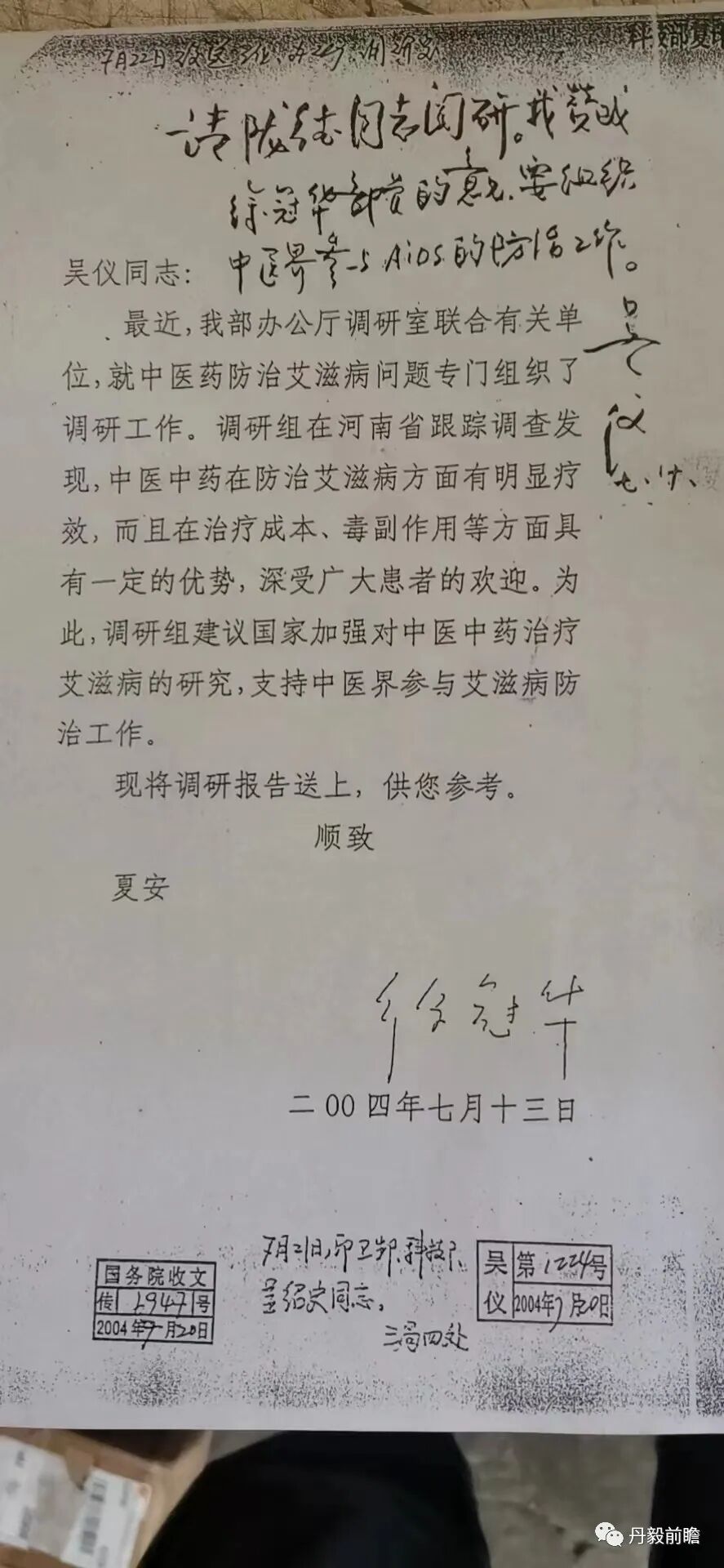 2004年7月13日,国家科技部部长徐冠华向国务院副总理吴仪打出报告,提出用中医药防治艾滋病。吴仪于次日批示:“我赞成徐冠华部长的意见,要组织中医界参与艾滋病的防治工作。”